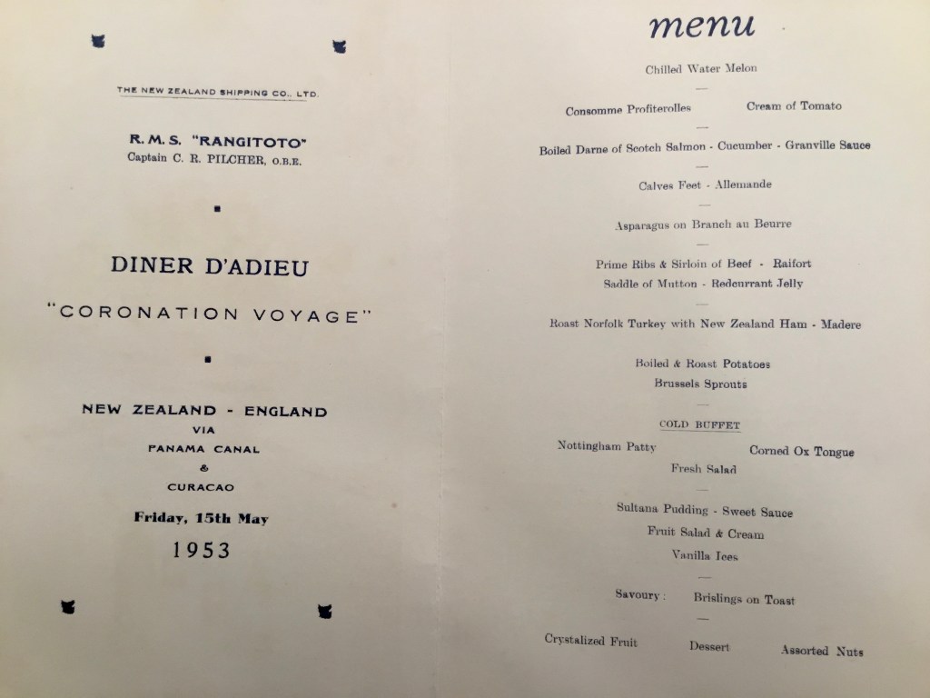 The dinner menu on the Rangitoto the night that Carl murdered his wife. The menu cover is displayed below.